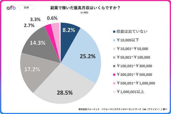 事前調査で「副業をしたことがある」と回答した全国の10代~60代の男女を対象とした「副業で稼いだ最高月収はいくらですか?」というアンケートを実施したところ、最も多かった回答は「¥10,001~¥50,000」で28.5%となりました。次いで、「¥10,000以下」が32.8%、「¥50,001~¥100,000」が17.2%と続きました。