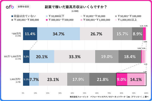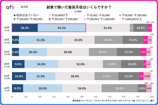 パフォーマンステクノロジーネットワーク「afb(アフィビー)」< https://www.afi-b.com/ >の開発運用をおこなう株式会社フォーイットは、全国の10代~60代までの男女500人を対象に副業に関するアンケートを実施し、年代別・世帯年収別等の特徴についてまとめました。