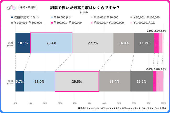 未婚・既婚別に見ると、未婚者で最も回答が多かったのは「¥10,000以下」で28.4%、既婚者で最も多かったのは「¥10,001~¥50,000」で29.5%となりました。