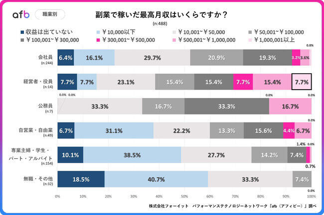 職業別に見ると、最高月収が「¥1,000,001以上」の回答率が最も高くなったのは「経営者・役員」となりました。