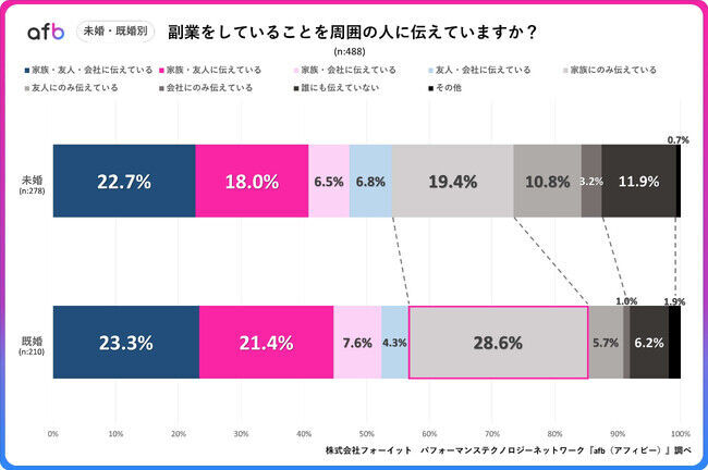 既婚者では、家族と生活や家計を共有している場合が多いため、副業への理解や協力を得るため、コミュニケーションの円滑化などのために伝えている可能性が伺えます。