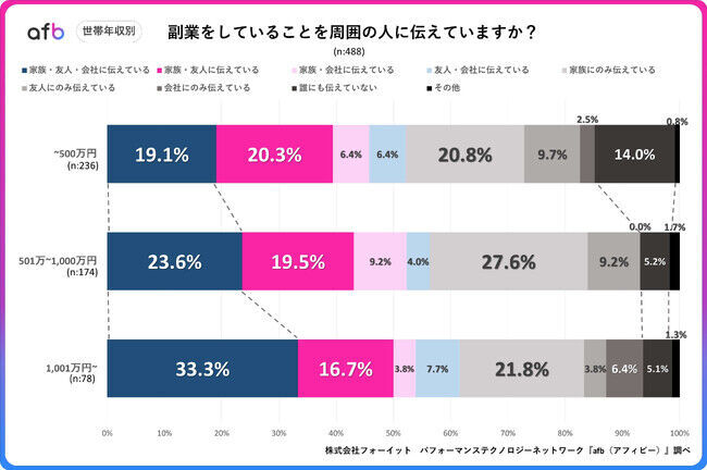 世帯年収1,001万円以上では、94.9%が「副業していることを周囲に伝えている」と回答!