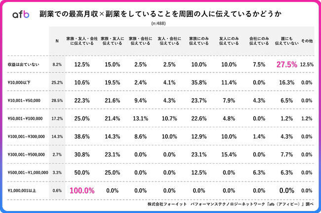 副業での最高月収と、副業をしていることを周囲に伝えているかどうかの掛け合わせで見ると、
