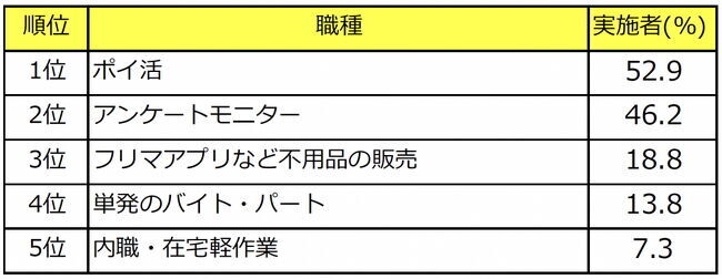 最も多かった副業は「ポイ活(ポイントを得られるサイトでポイントを貯める)」で52.9%、アンケートに答えて報酬を得る「アンケートモニター」も46.2%が経験しています。3位は「フリマアプリなど不用品の販売」が18.8%と、1~3位までスマートフォンを使って気軽にできる副業が並び、主婦たちがスキマ時間をうまく使って副業で稼いでいることが分かりました。