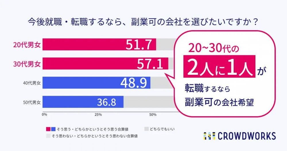 企業と個人をつなぐオンライン人材マッチングプラットフォームを開発・運営する株式会社クラウドワークス(本社:東京都渋谷区 代表取締役社長 兼 CEO:吉田 浩一郎 以下「当社」)は、本業を持つ全国の20代~50代の男女を対象に、「転職時の副業意向調査」を実施いたしました。その結果、各世代を合わせた全体のうち48.6%以上の人が「転職するなら副業可の会社」と回答、20代では51.7%、30代では57.1%と、若年層ほどその値が高く、30代でもっとも副業意欲が高まることが判りました。