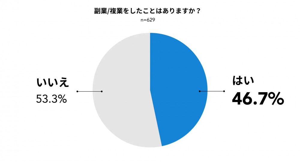 まずは副業/複業経験の有無について調査したところ、「経験あり」と回答したのは46.7%でした。2年前に自社で実施した複業/副業の実態調査※(33.6%)と比べると経験者の割合は約1.4倍に増加しました。