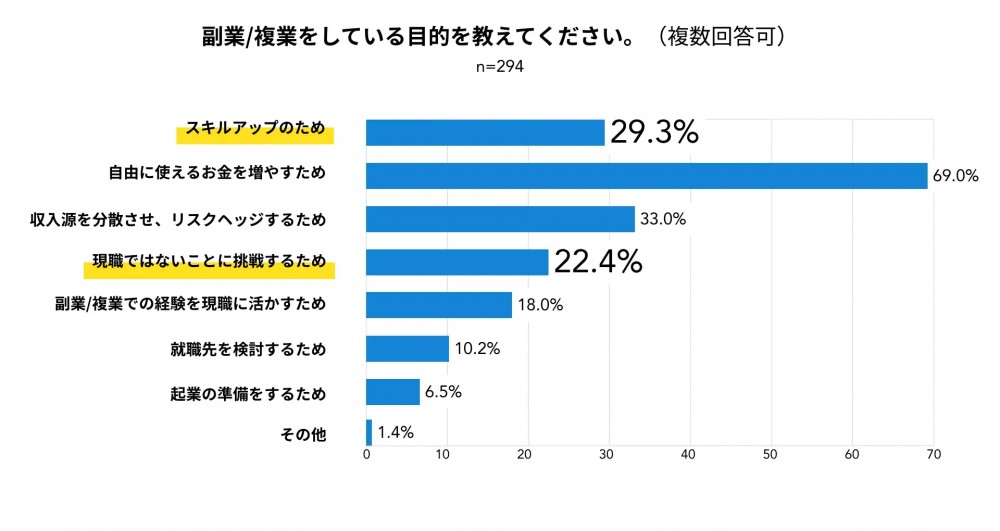 副業/複業経験がある方に対し、実施する目的を聞いたところ「自由に使えるお金を増やすため」が69%、「収入減を分散させ、リスクヘッジするため」33%となりました。そして「スキルアップのため」29.3%「現職ではできないことに挑戦するため」22.4%が続き、キャリアを考える上での選択肢として副業/複業を捉えている方もいました。