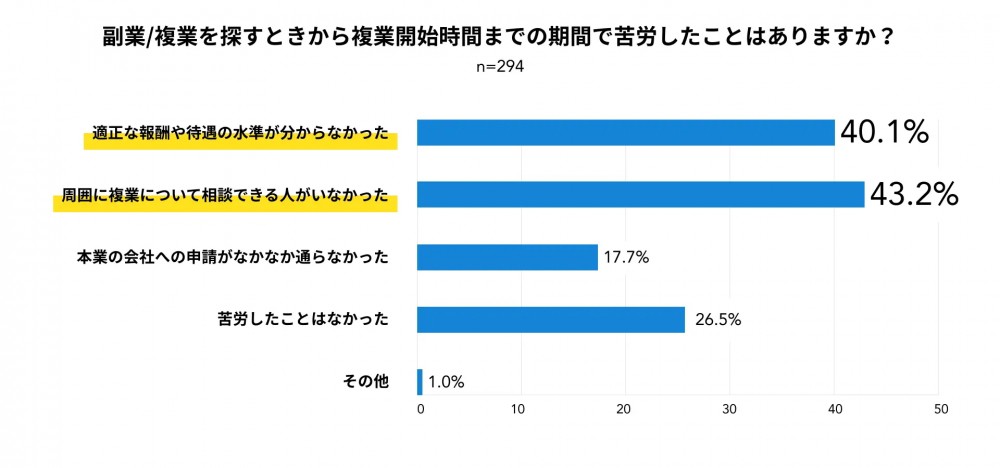 また副業/複業を探す時から開始時までの期間で苦労したことはあるか質問したところ、2.5人に1人が「周囲に副業について相談できる人がいなかった」「適正な報酬や待遇の水準が分からなかった」と回答しました。複業・副業への関心は着実に高まっているものの、適切な報酬水準の不透明さや相談相手の不在が主な課題となっています。