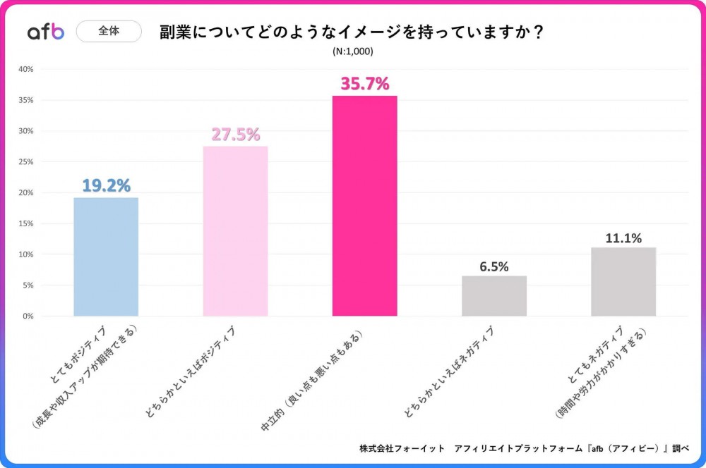 全国の20代〜60代の男女を対象に、「副業についてどのようなイメージを持っていますか?」というアンケートを実施したところ、最も多かった回答は「中立的(良い点も悪い点もある)」で35.7%でした。次いで、「どちらかといえばポジティブ」が27.5%、「とてもポジティブ(成長や収入アップが期待できる)」が19.2%で続くという結果になりました。