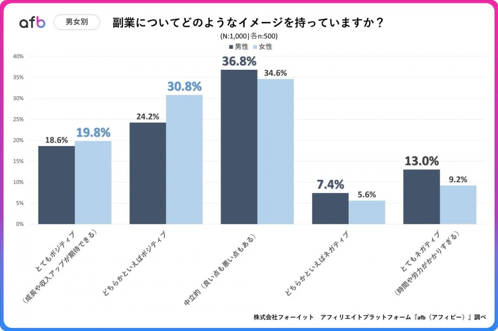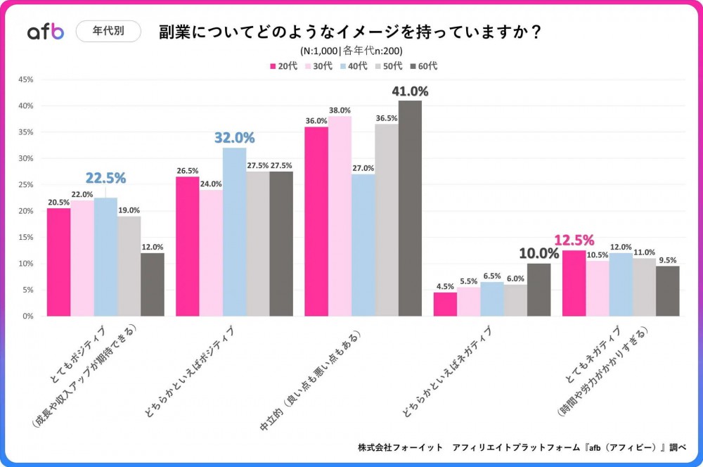 アフィリエイトプラットフォーム「afb(アフィビー)」< https://www.afi-b.com/ >の開発運用をおこなう株式会社フォーイットは、全国の20代~60代までの男女1,000人を対象にアフィリエイトに関するアンケートを実施し、年代別等の特徴についてまとめました。