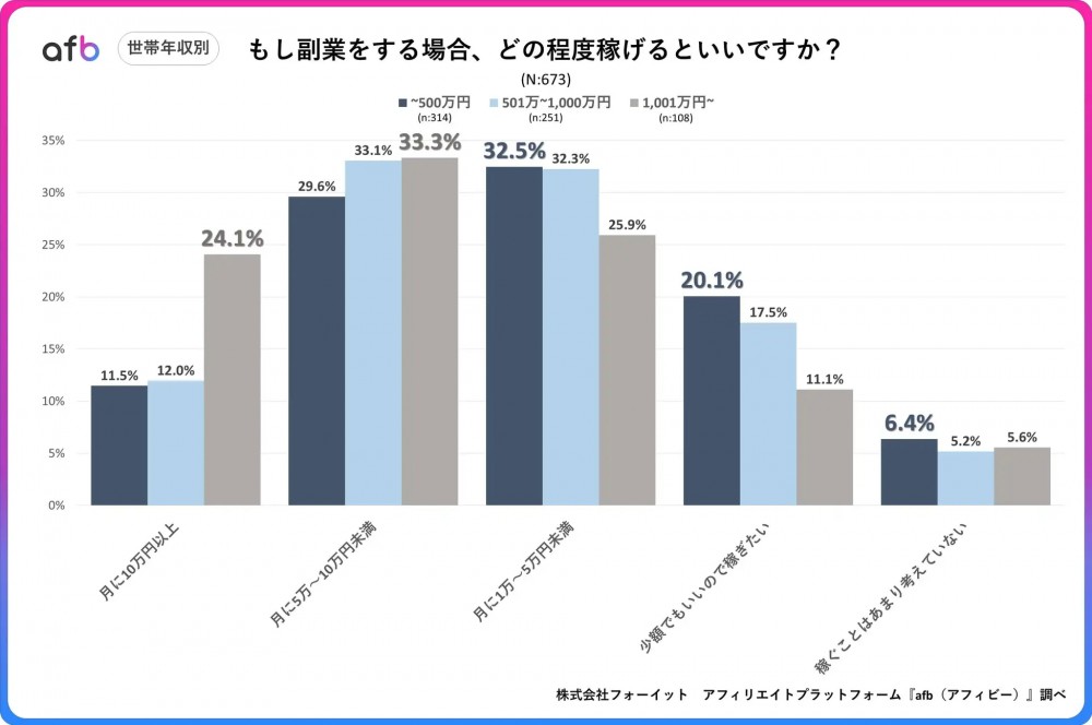 副業するなら月いくら稼ぎたい?「5万~10万円未満」が最多も、性別・世帯年収別などによって異なる結果に