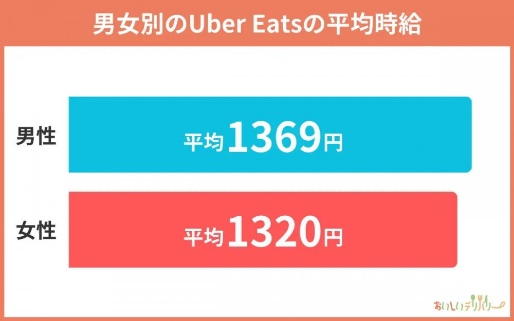 Uber Eatsの平均時給を男女別に比較すると、男性は1,369円、女性は1,320円となり、男性の方が49円高いという結果になりました。