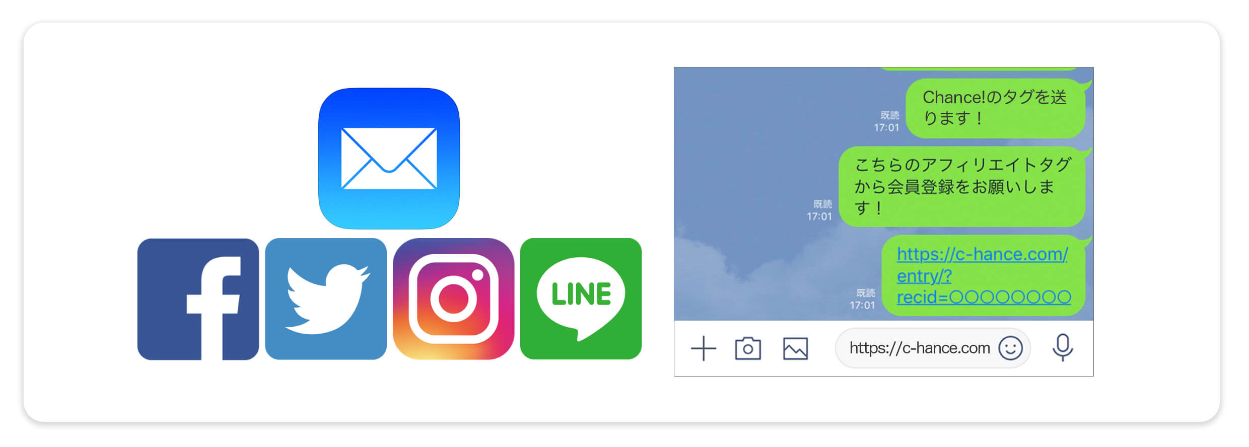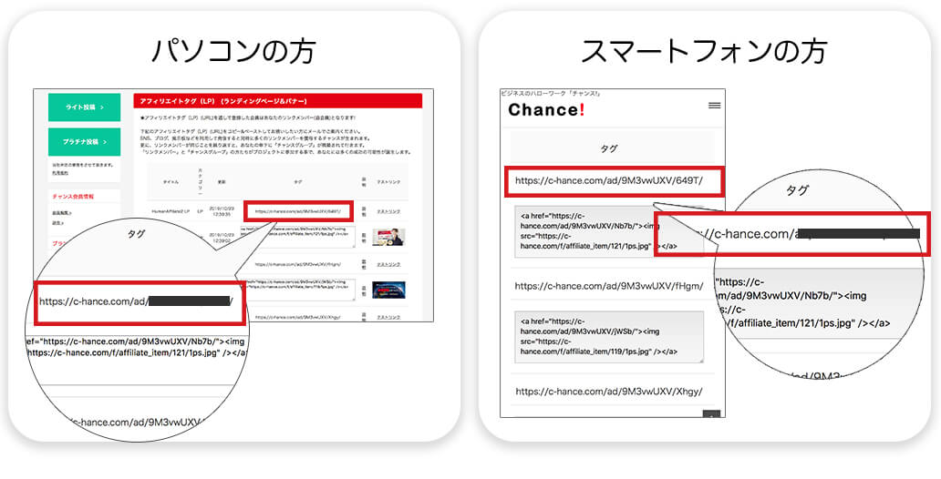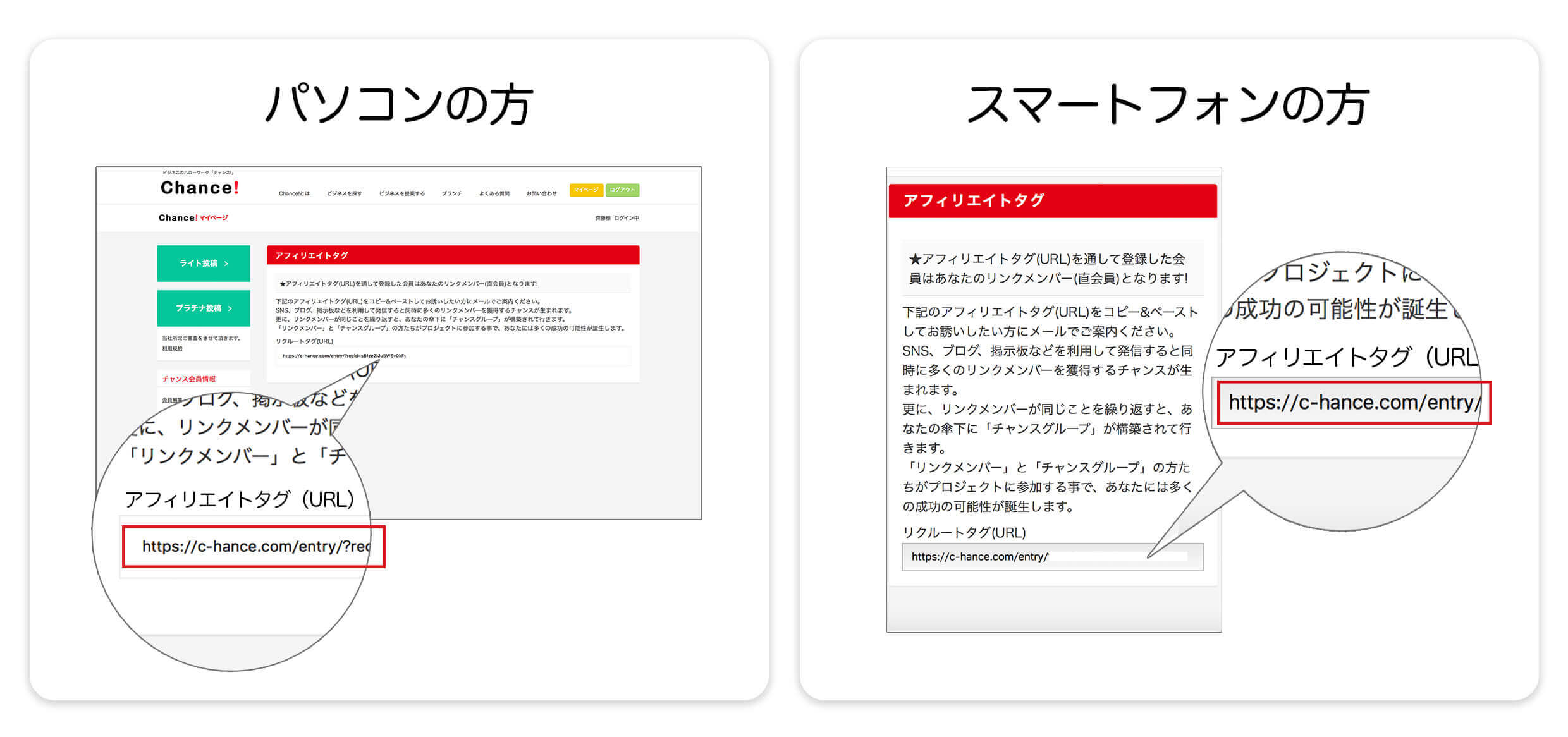 直会員(リンクメンバー)、またはその傘下の会員が、貴方と同じようにリクルートタグを使って新規会員をChance!にお誘いすることでチャンスグループが無限に拡大していきます。