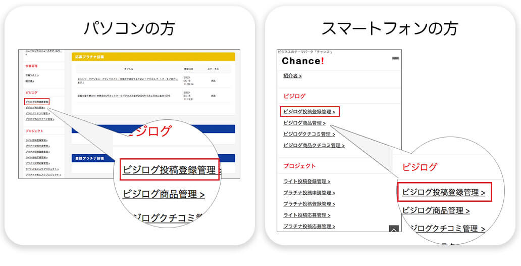 1.まず、マイページのサイドメニューにある「ビジログ投稿登録管理」をクリックします。