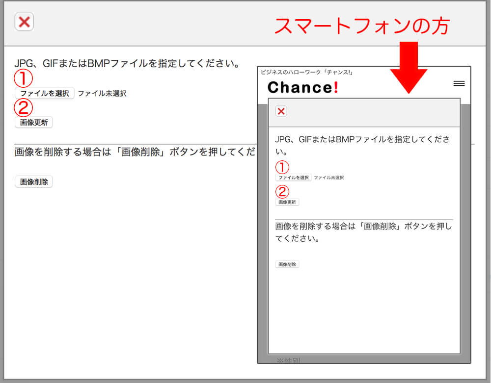 3.①「ファイルを選択する」で画像を選び、アップロードが完了したら②「画像更新」の順番で身分証を登録してください。