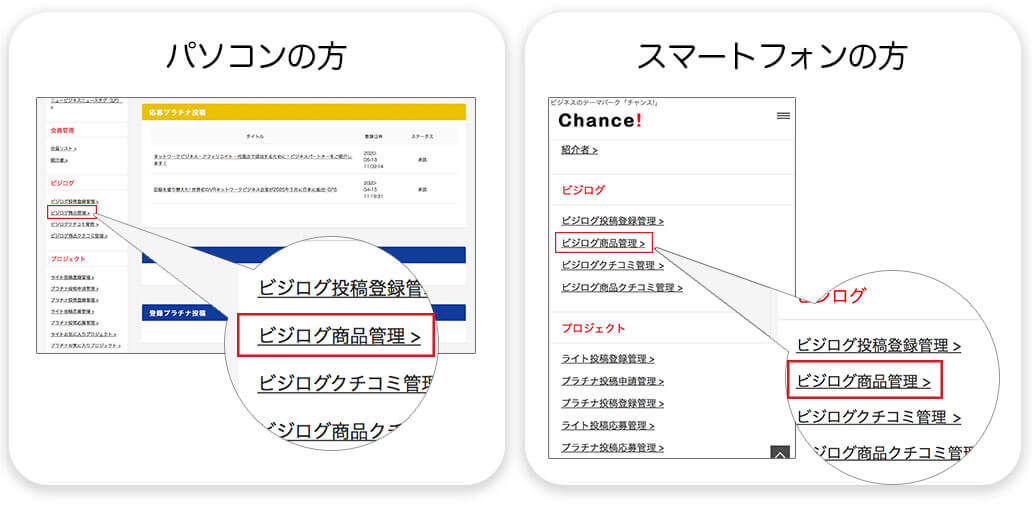 1.まず、マイページのサイドメニューにある「ビジログ商品管理」をクリックします。