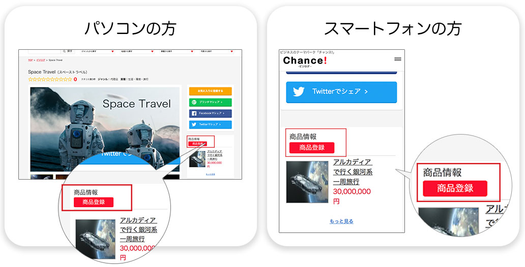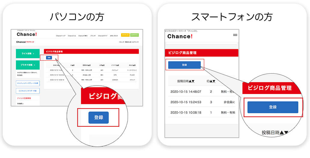 1.ビジログページの「商品登録」ボタンをクリックします。