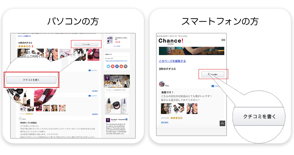 1.まず、ビジログまたは商品ページの「クチコミを書く」ボタンをクリックします。