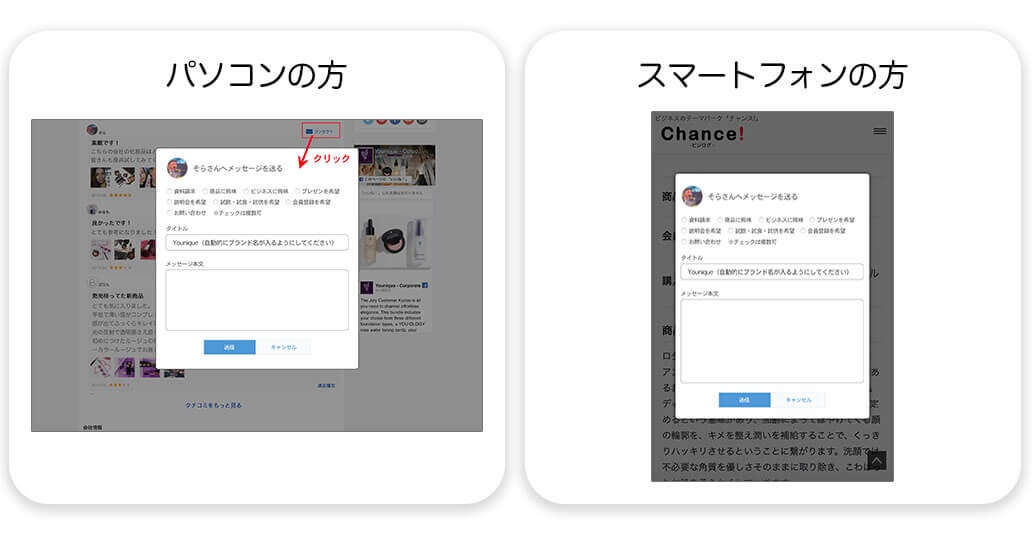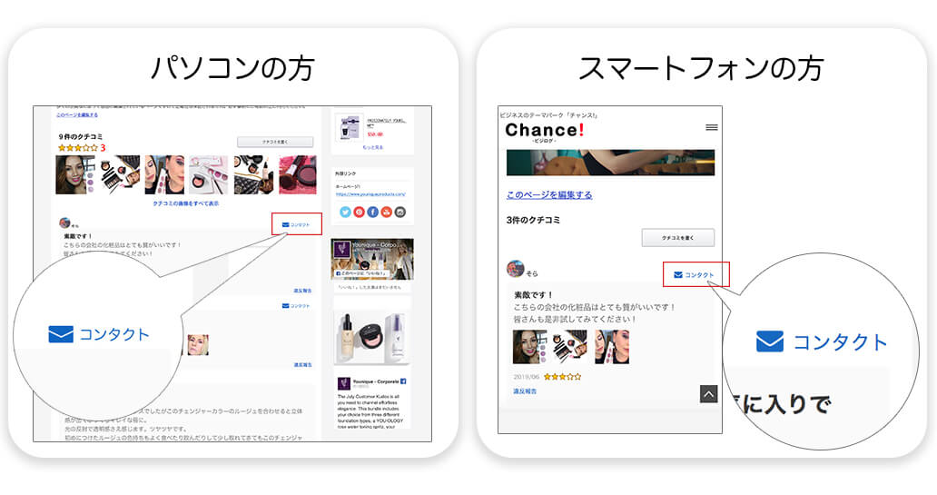 1.まず、ビジログまたは商品ページのクチコミに「コンタクト」ボタンがあるのでクリックします。