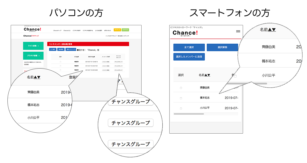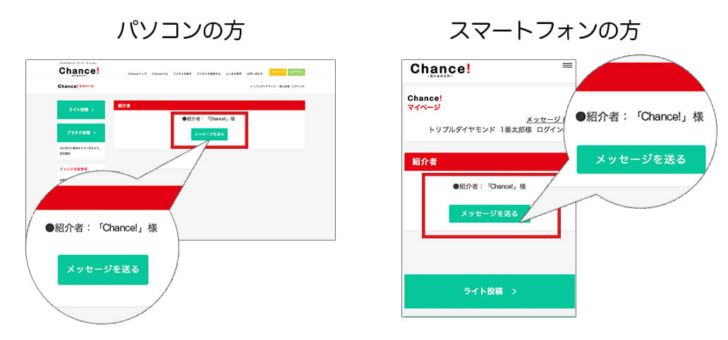 チャンスグループとは、貴方が外部からマイページ内のリクルートタグなどを使ってChance!にお誘いした直会員(リンクメンバー)から始まるグループです。