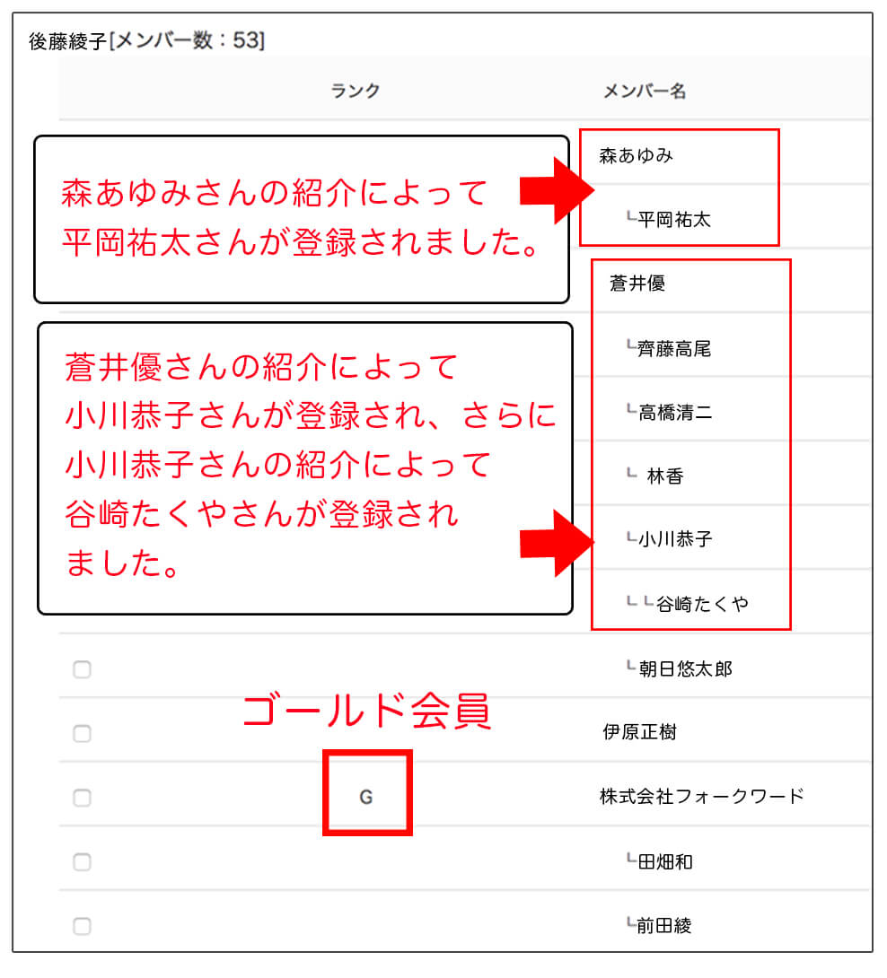 1.マイページに入り、会員管理の中の会員リストをクリックするとあなたの紹介で登録されたメンバーを確認することができます。