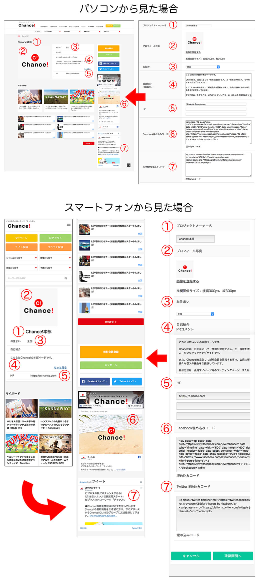 マイサイト編集では①ニックネーム、②プロフィール写真、③お住まい、④自己紹介、⑤ホームページリンクを変更することができ、⑥Facebookと⑦twitterを埋め込むことができます。