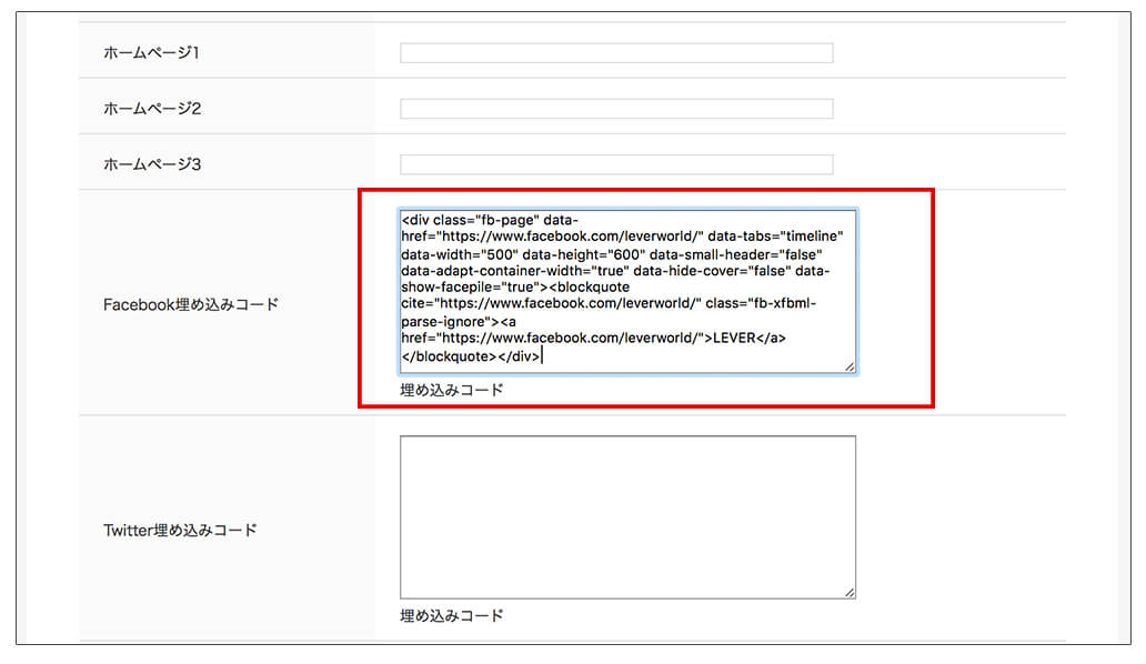4.Facebook埋め込みコードを入力するフォームに先ほどコピーした埋め込みコードをペーストし、確認画面へ進みます。