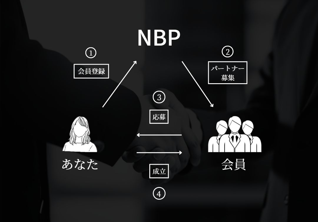 申請フォームに「あなたのプロフィール」「探しているパートナー候補」「伝えたいビジネス」の内容をご入力の上お申込み下さい。 NBP の会員にお知らせして希望者を募ります。
