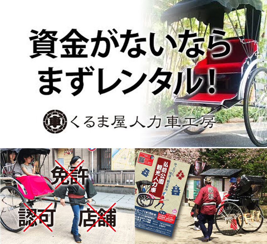 - 開業に免許・認可・店舗など不要で、人力車さえあれば今すぐに開業して現金収入が得られます。