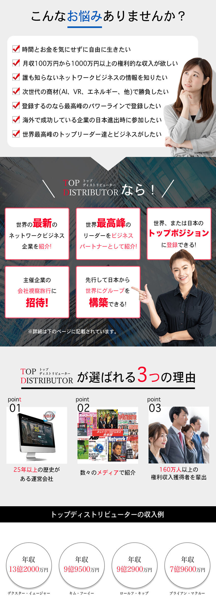 - 数々のメディアで紹介され、25年の歴史があるネットワークビジネス未来館が運営する「トップディストリビューター」(前ネットワークビジネス人材バンク)は、