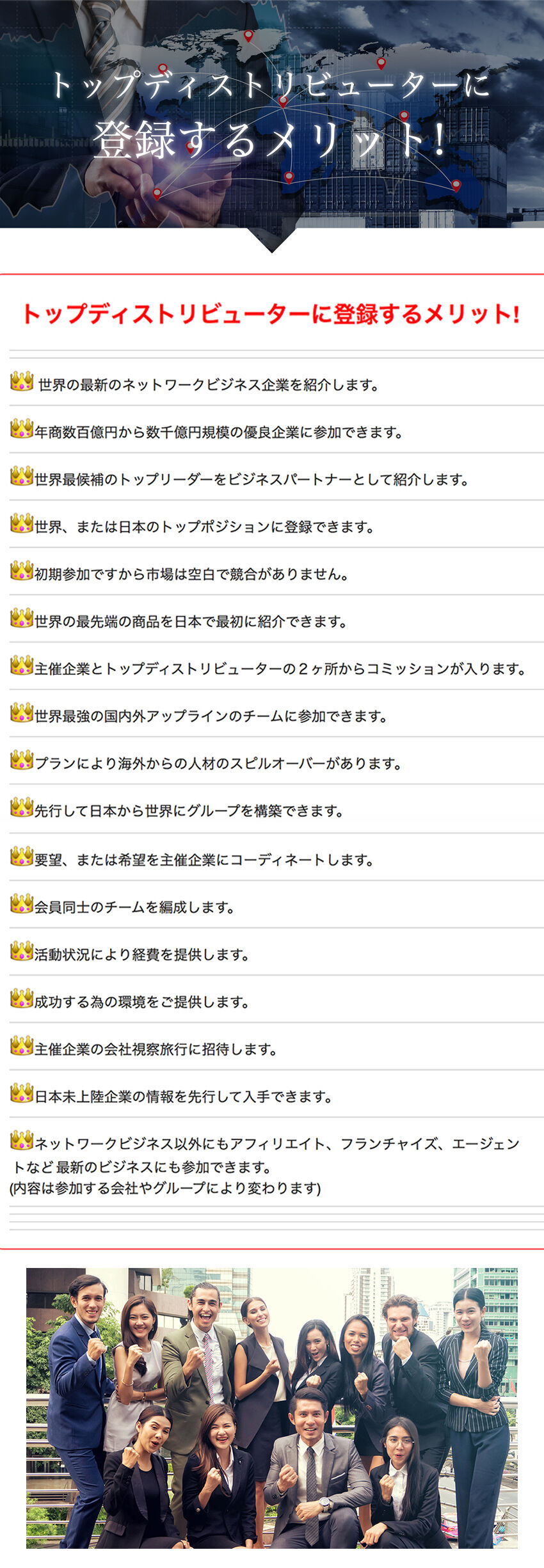 - 世界10000社以上のネットワークビジネス企業と日本のリーダー候補を結ぶ日本で唯一の総合窓口です。