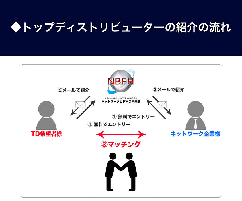 - ネットワークビジネス未来館が運営する「トップディストリビューター」(前ネットワークビジネス人材バンク)は、世界のネットワークビジネス企業と日本のリーダー候補を結ぶ日本で唯一の総合窓口です。