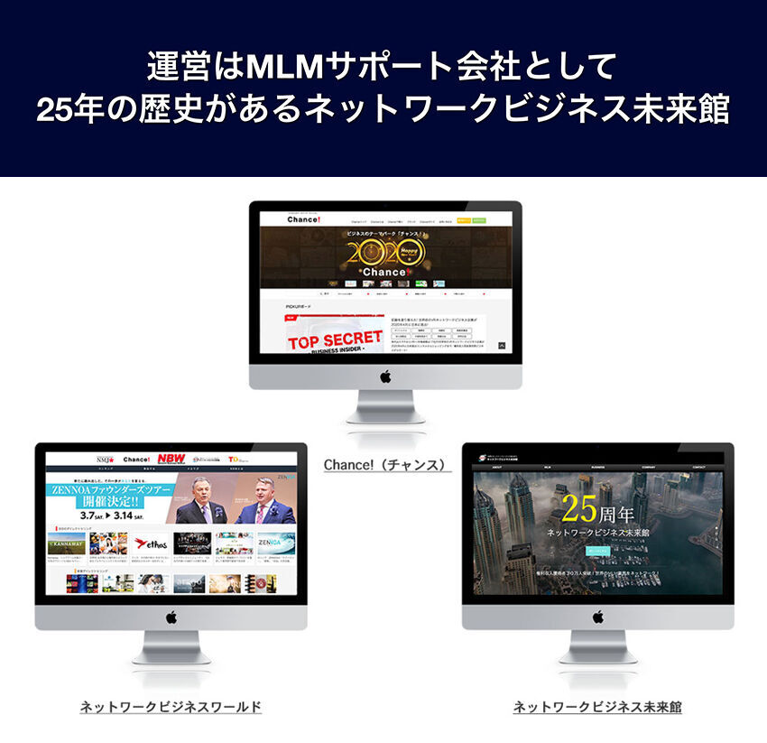 - また、運営する日本で最も歴史があり、過去に13億人以上の人たちがアクセスした国内最大級のネットワークビジネス総合サイト「ネットワークビジネスワールド」とネットワークビジネス動画専門サイト「MLMTV」においては、過去に1千社以上のネットワークビジネス(権利収入型ビジネス)の情報を